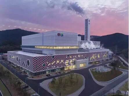 寧波市鄞州區生活垃圾焚燒發電廠坐落于青山綠水之間,深紅色...